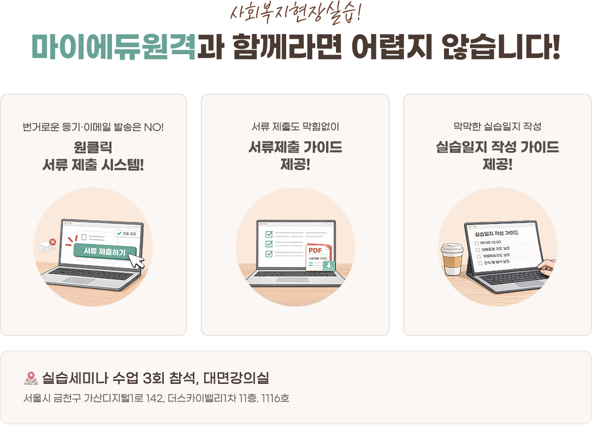 다시 듣게 된다면 꼭 같은 교수님들께 수강하고 싶을 정도로, 이곳에서의 학습이 정말 만족스러웠습니다. 마이에듀원격평생교육원에서..