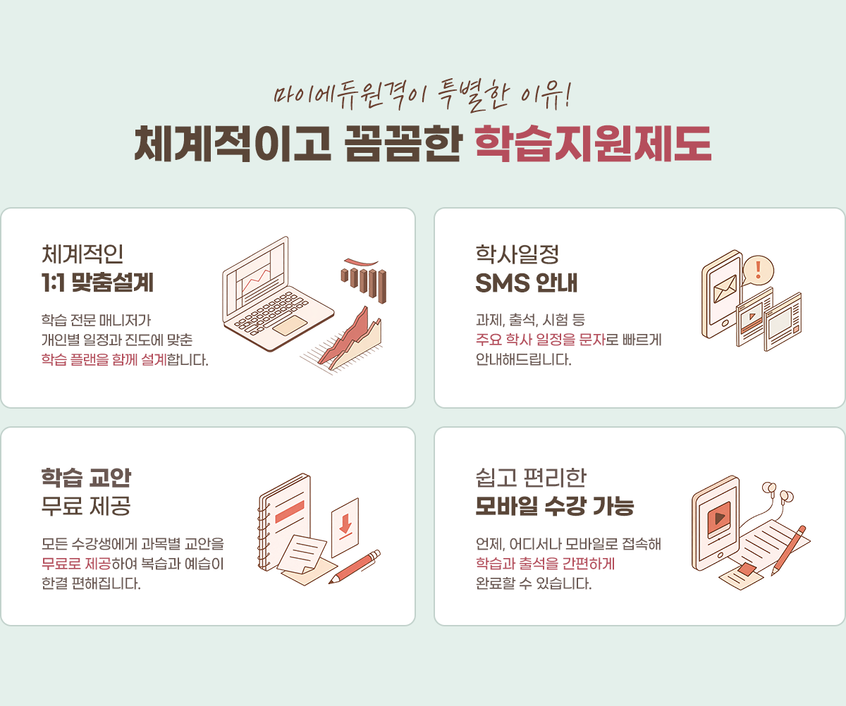접해 본 적 없던 과목과 수업 방식에 혼자서 경영학 공부를 잘 해낼 수 있을지 걱정이 앞섰는데, 체계적이고 효율적인 마이에듀원격평생교육원의 커리큘럼 덕분에 부담감을 덜 수 있었습니다.